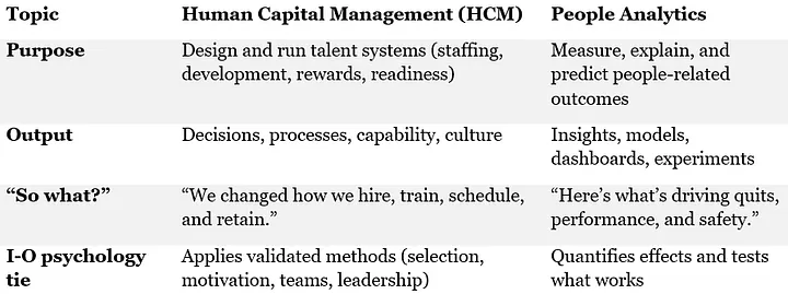 People analytics is about analyzing people data to solve business problems; HCM is where you actually change the system (and absorb the complaints) [1].